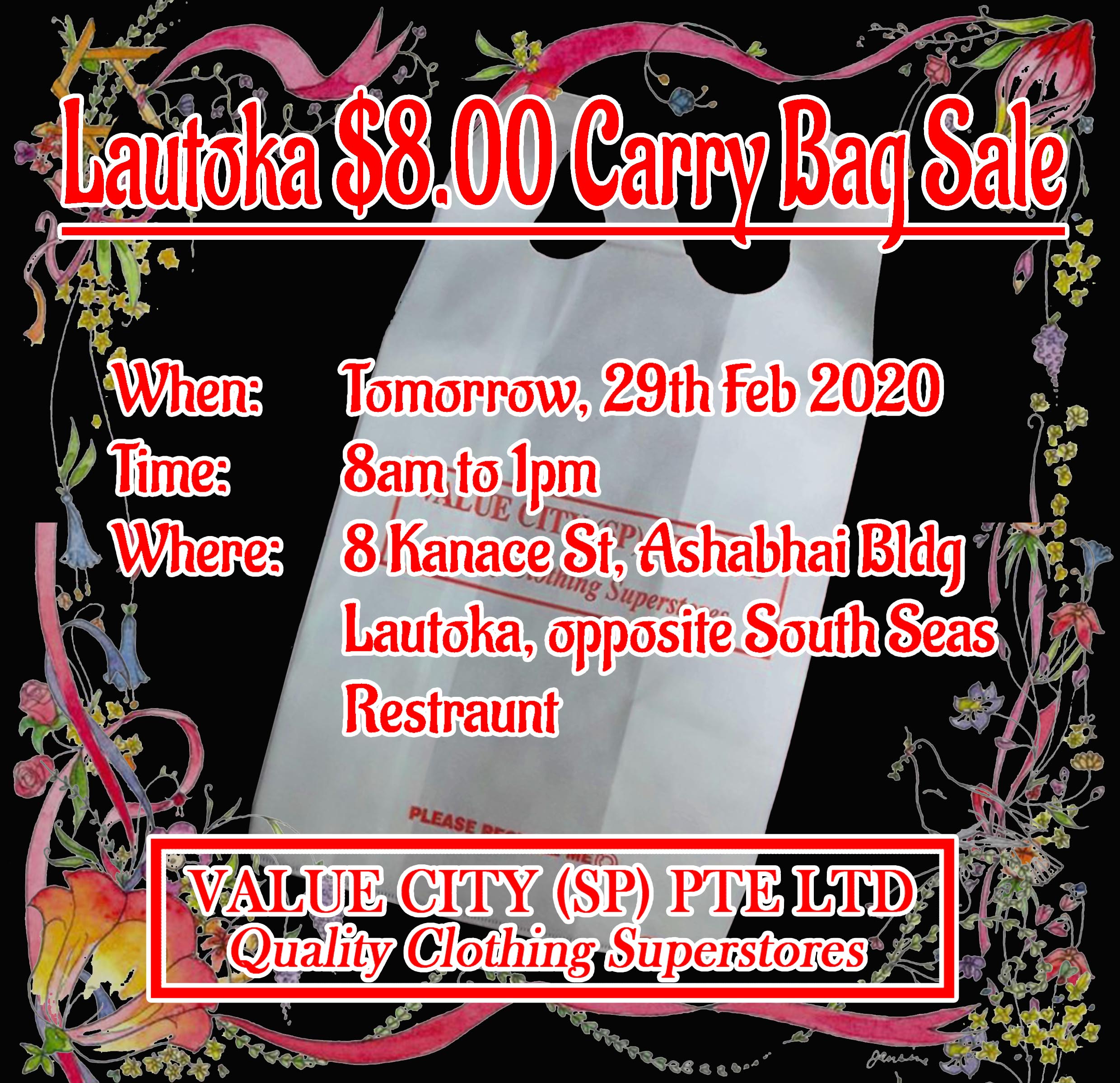 Lautoka $8.00 Carry Bag Sale starting tomorrow, 29th February 2020 at 8am to 1pm, located at 8 Kanace St, Ashabhai Building, Lautoka, opposite South Seas